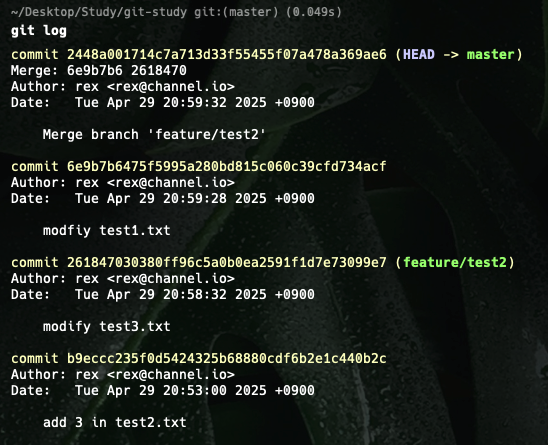 어떠한 hash값이 저장된 것을 볼 수 있고 이는 feature/test1의 최신 commit hash값과 동일한 것을 알 수 있다.